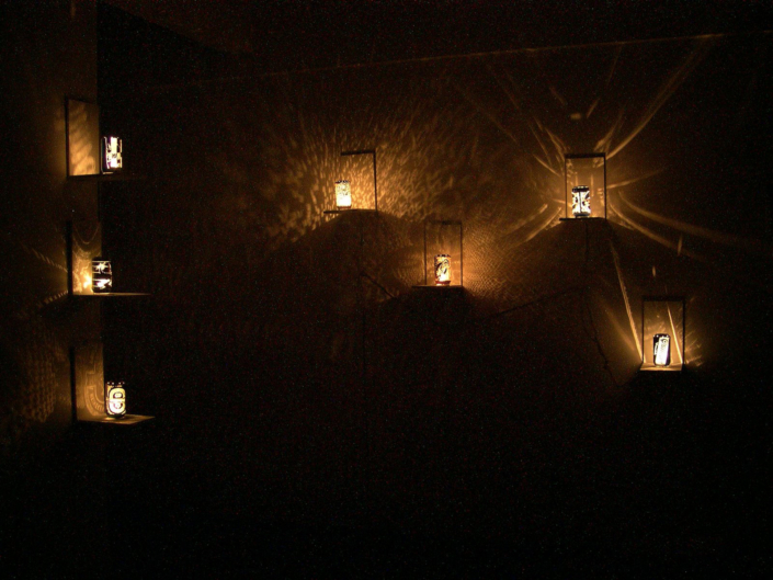 354 cm luz, Sonoridad Amarilla / Latas de gaseosa y cerveza iluminadas con lámparas de 5 wts